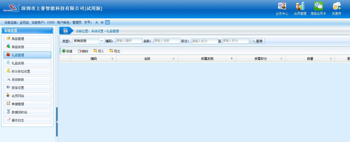 系统设置功能有:商品管理、商品类别、礼品管理、礼品类别、积分折扣设置、系统参数、短信设置、会员网站、单据管理、数据回收站、操作日志等等,用于管理商品以及找回被错删的资料和积分折扣等设置功能。
